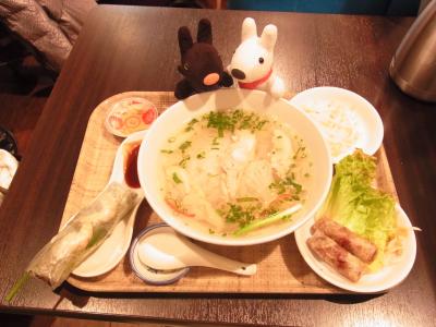今回、ランチセット(鶏肉が入ったフォー)をオーダー。揚げ春巻きと生春巻きが付いていました。