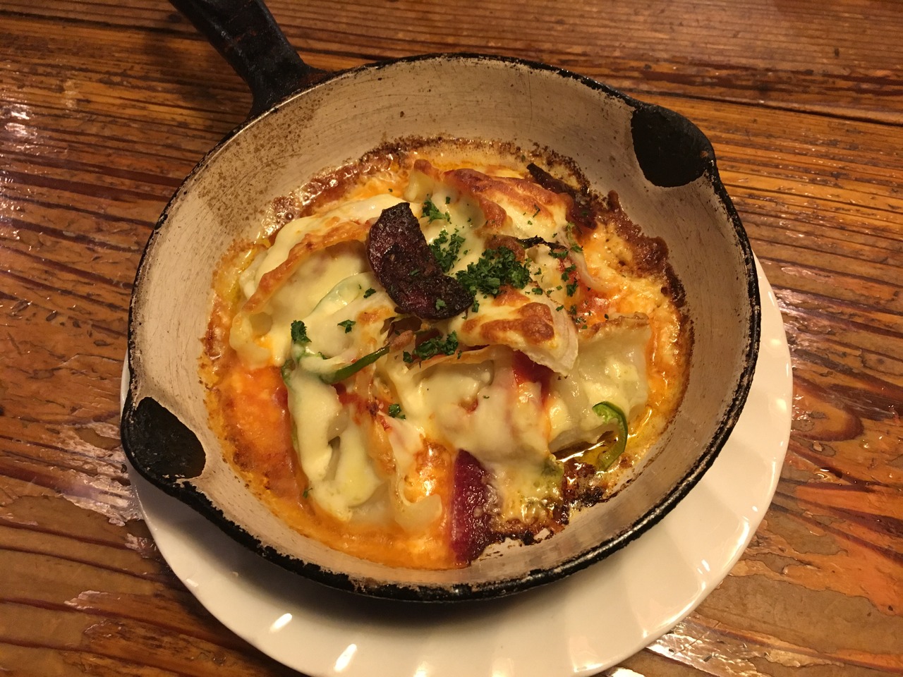 私たちはワイン、カルパッチョ、生ハムとルッコラのピッツァ、チーズが乗った餃子などをオーダー。