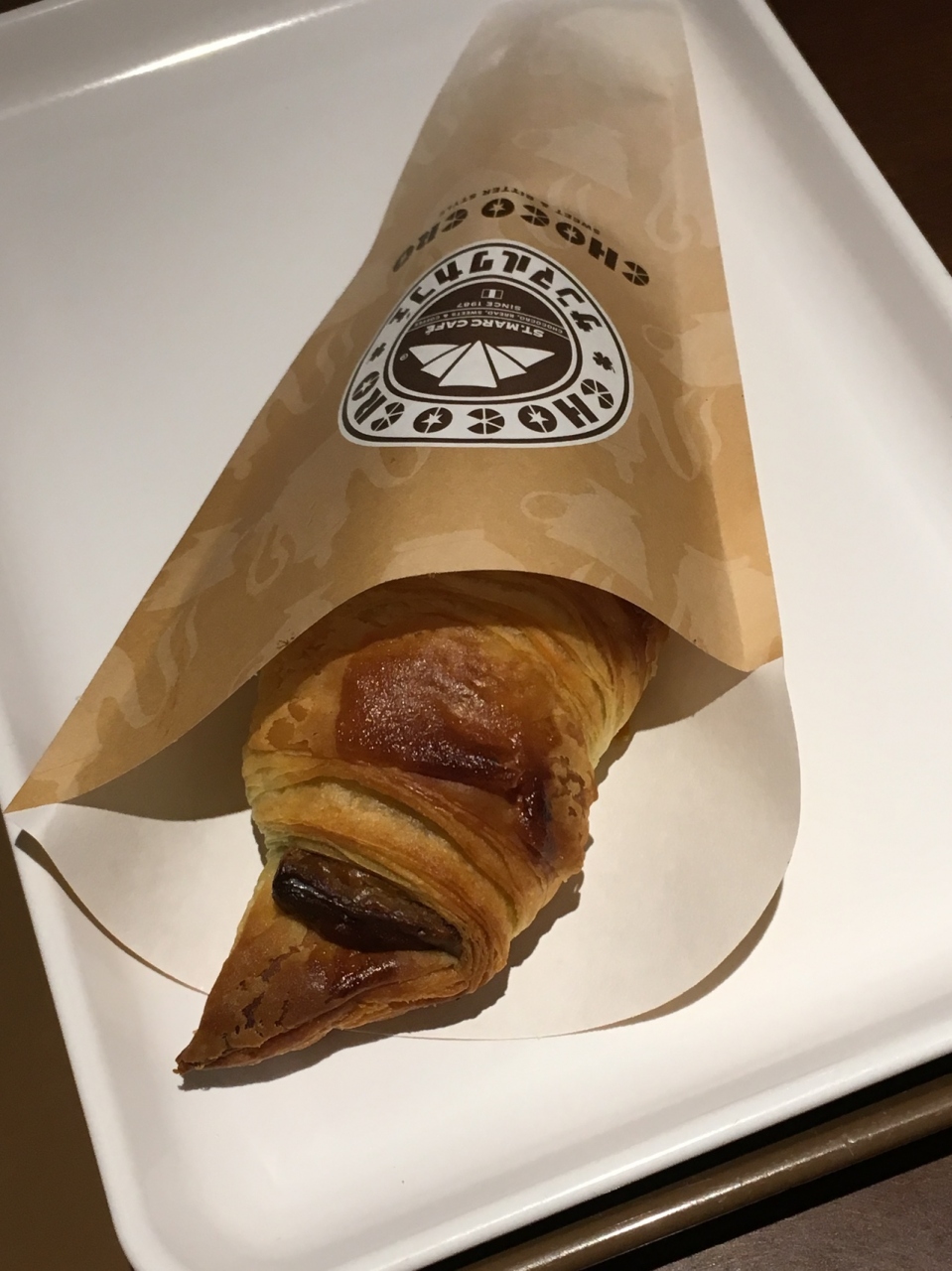 微かにミルクティーの香りがするチョコレートが、クロワッサンの中に入っていて、お味は普通。