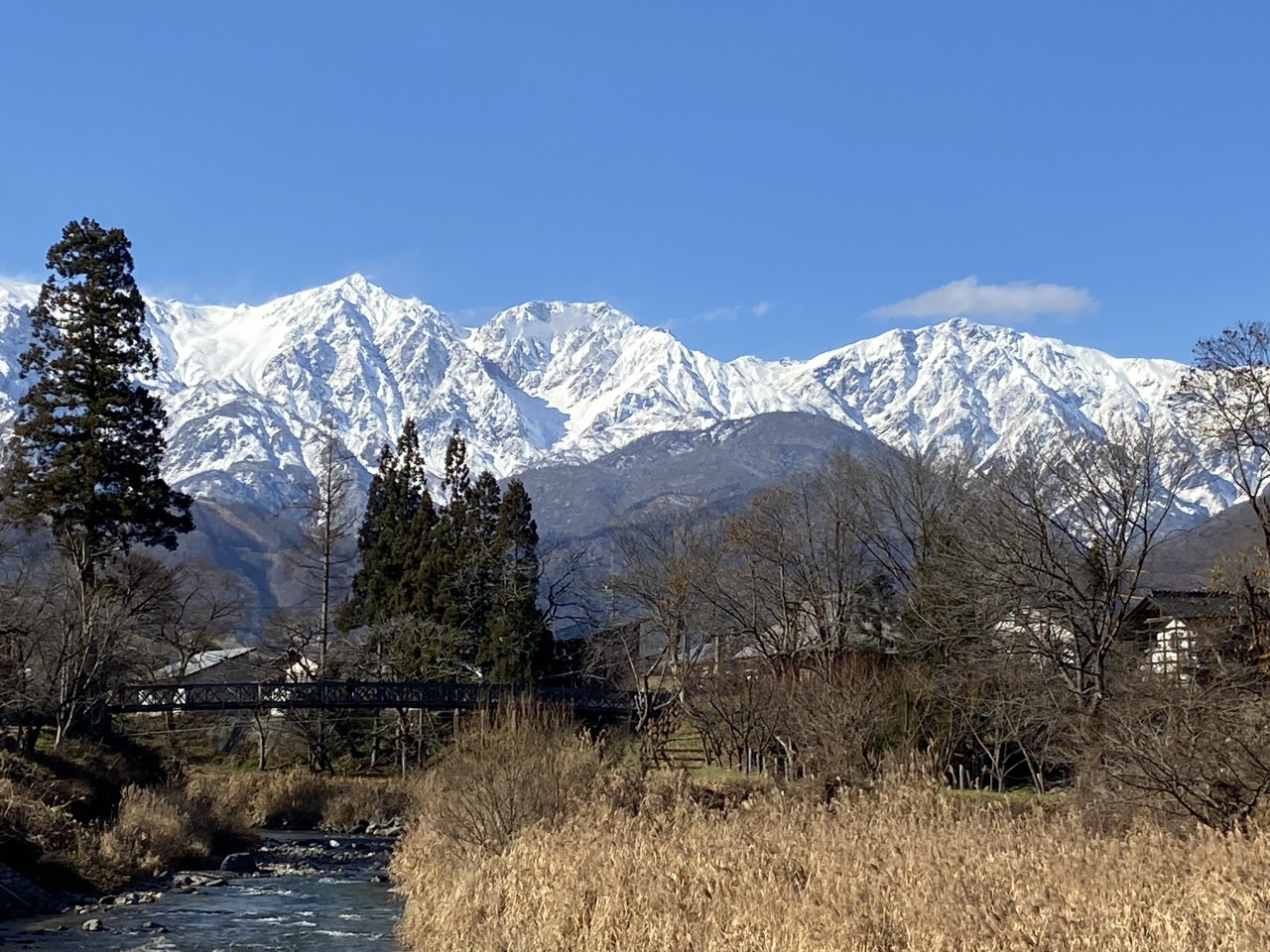 白馬三山を見るには抜群のロケーションです。川とつり橋も撮影の背景として最高です。