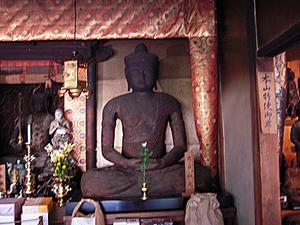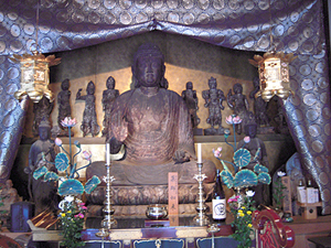 鉄筋の宝蔵庫の中には仁聞(にんもん)の遺作と伝えられる九体の仏像が安置されています。本尊の阿弥陀如来像は藤原期の作と言われ、寄木造りの巨像、像高は2.17メートルもあります。その周りに鎮座するのは四天王像。こちらも藤原期の作。四天王は四方を守護する神として考えられ、その形相は邪鬼をもおとなしくさせてしまいます。その隣には不動三尊像・中央に不動明王、右側に矜羯羅童子(こんがらどうじ)・左側に制咤迦童子(せいたかどうじ)この三尊も藤原期の作と言われています。密教におけるの最高の神、大日如来の化身とも言われ、憤怒相はまさに荒れ狂う情熱です。熊野磨崖仏の不動様とはまったく違う表情ですね。そしてその左側には水牛に乗った大威徳明王(だいいとくみょうおう)が鎮座しています。高さ1.3メートル、この木造としては日本一大きな大威徳明王像は、六面六臂六足、頭に3面をいただいています。この像も藤原期の作と言われ、水牛に乗っているところから農民にも親しまれ、信仰されて来ました。