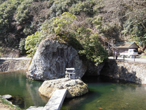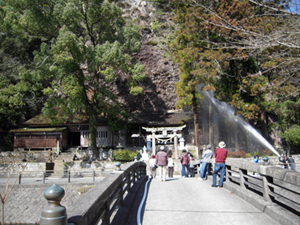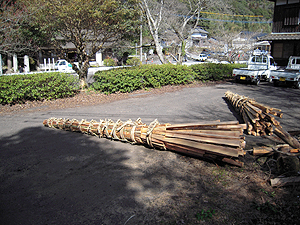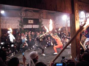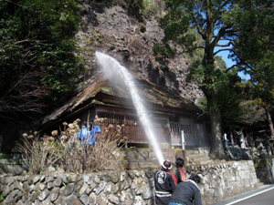 本堂にはかつて国宝に指定されていた五体の木造仏も朽ち果てたお姿で安置されています。背後には天念寺耶馬といわれる奇岩が連なり、10箇所ほどの仏龕があり、峰入り最大の難所、無明橋もあります。今晩、ここでは修正鬼会が行われます。天念寺では鬼会の準備が着々と行われていました。6メートルの大松明、火祭りなので近くの天念寺川から水をくみ上げ本堂に水をかけています。川の中には不動三尊の磨崖仏が鎮座しています。川中不動。川の中にあることから、度々見舞われた水害を除く祈念から建立されたのでしょう。隣には「鬼会の里」という建物ができていました。ここでは映像で鬼会の様子を見ることができます。