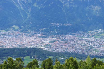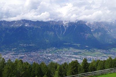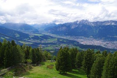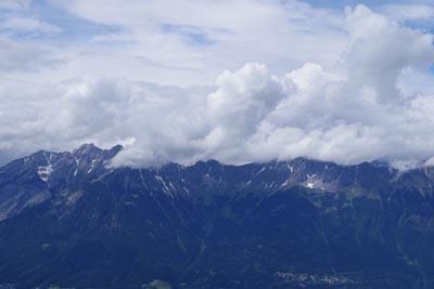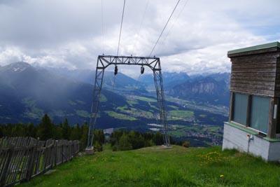 イグルスの駅から10分少しでロープウェイ乗り場に到着。ここも インスブルックカードで乗れます。ロープウェイは徐々に高度上げて行き、下にはインスブルック冬季オリンピックで使用したリュージュやボブスレーのチューブが残っていました。ロープウェイを乗り継ぎ、1952メートルのパッチャーコーフェルに到着。雲一つない天気に恵まれました。目の前にはさっき行ったハーフェレカーが見えます。やはり頂上は雲に覆われています。でも、ここからの景色は本当にきれいでした。
