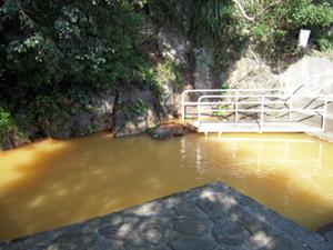 姫島拍子水温泉は比売語曽社(ひめこそしゃ)の隣にできた温泉施設です。名前の由来は七不思議のひとつ、拍子水から来ています。ここはお姫様がおはぐろをつけたあと、、口をゆすごうとしたが水がなく、手拍子を打って祈ったところ、水が湧き出たので拍子水といいます。今でも、池に向かって手を打つと水がボコボコと湧き出てきます。口に含んでみるとちょっと鉄さびくさいがとても強い炭酸水です。拍子水温泉はここの水を加熱しています。