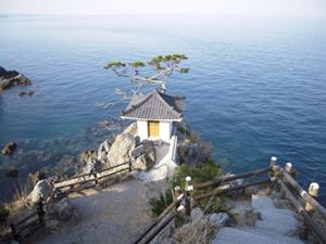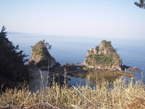 港の反対側にある、観音崎。ここは高さ40メートル、乳白色の黒曜石の断崖が120メートルにも及んでおり、国の天然記念物に指定されています。この断崖の上には七不思議のひとつ、千人堂があります。大晦日の夜、債鬼に追われた善人を千人かくまうことができるのでこの名があります。海岸線から登山道を登ること約10分、観音崎に到着。ここからの景色は最高です。近くには夫婦岩が見えます。水もとてもきれい。しばし見とれてしまいました。