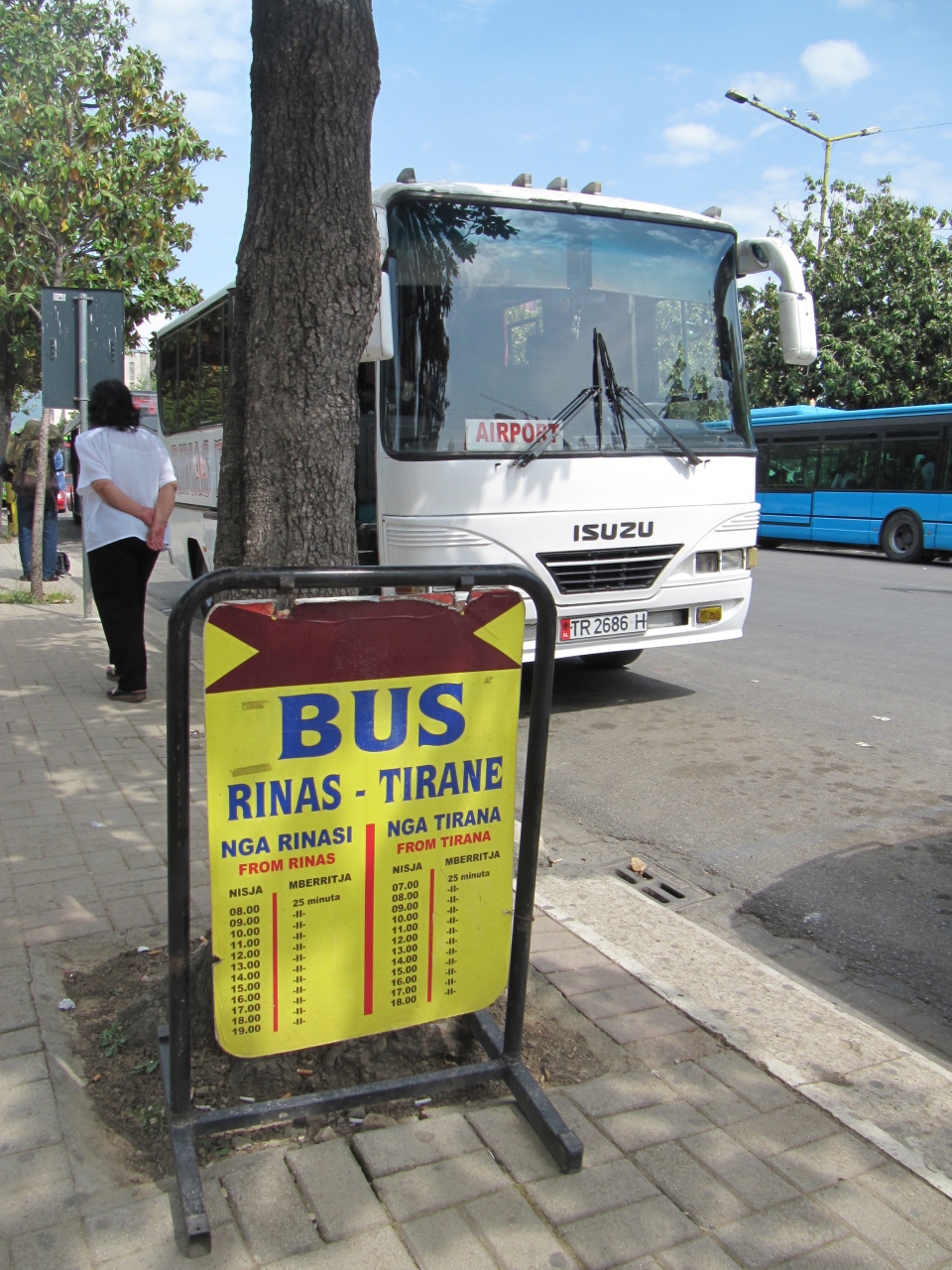 ティラナ市内発の空港バスのバス停ですが、現時点で最新の2017-18版の某ガイドブック記載の位置(Mine Peza通)から移転していました。前のバス停があったところにいた人、infoなどに聞いて探しました。2018年5月現在、オペラ座東の公園の中の道沿いにあります。看板が立っています。空港からは8~19時の1時間ごと、市内中心からは7時~18時の1時間ごと正時発、料金は250レク。所要30分程度。