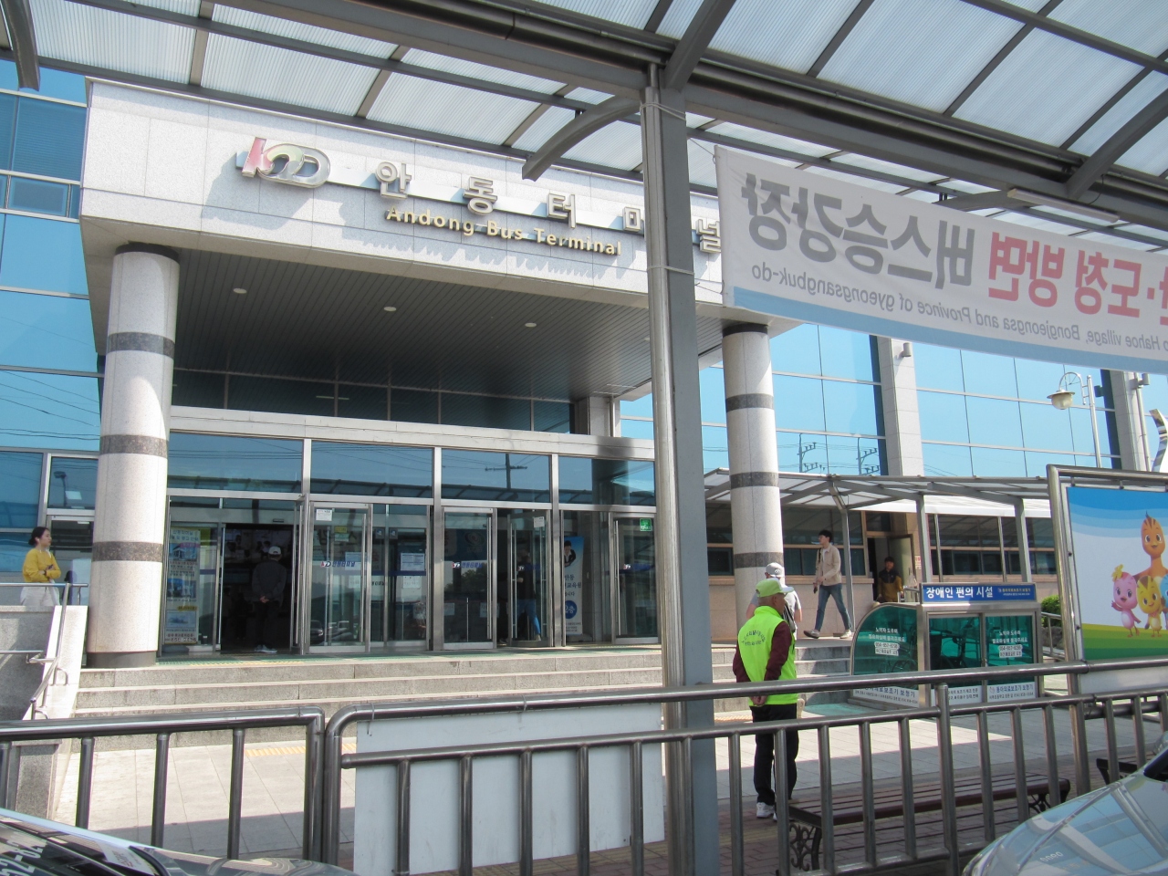 釜山のNopoバスターミナルから高速バスで、安東バスターミナル(市内中心部(安東鉄道駅)から離れているので注意)へ移動。安東バスターミナルにはインフォメーション、食堂とコンビニ、土産店、外に御手洗あり。正面?入口に、安東河回村行きの市内バスとタクシー乗り場。建物を背に、右側に市内行き等のバス停。