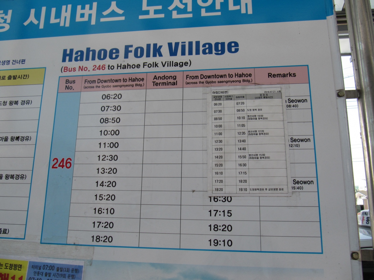 東河回村行きの時刻表の左列の時刻は、安東市内中心部の出発時刻、安東バスターミナルには20~25分後が目安。バスターミナルの出発時刻は書かれていないので注意。往路は村の入口で下車後、入場券購入、シャトルバスに乗換、復路は村内2箇所のバス停と村の入口からも乗車可能。- 旅行時期