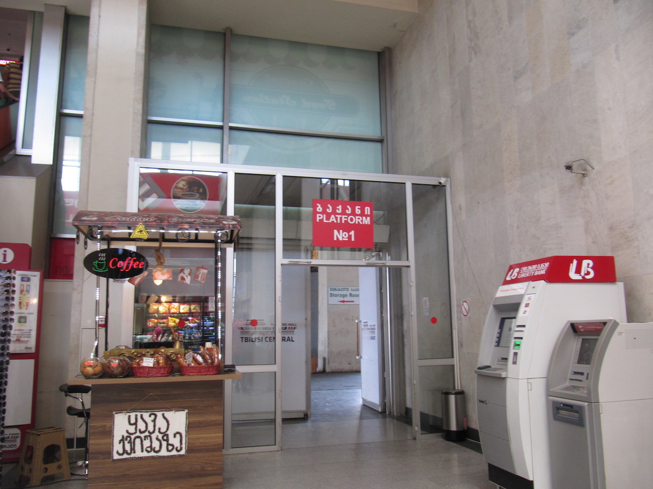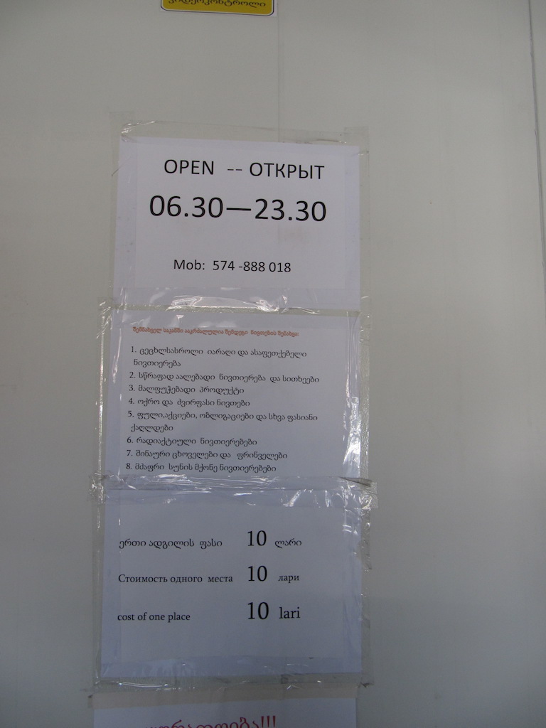 トビリシ鉄道駅の日本式の2階にある1番ホームを左手に進んだところにある有人の荷物預かり。営業時間は6:30-23:30、一つ10GEL(約400円)。パスポートが必要、書類にサインし、写しが引換券になります。荷物預かりの担当の方が建物内のロッカーに荷物を入れ、引換終了時間を念押しされます。