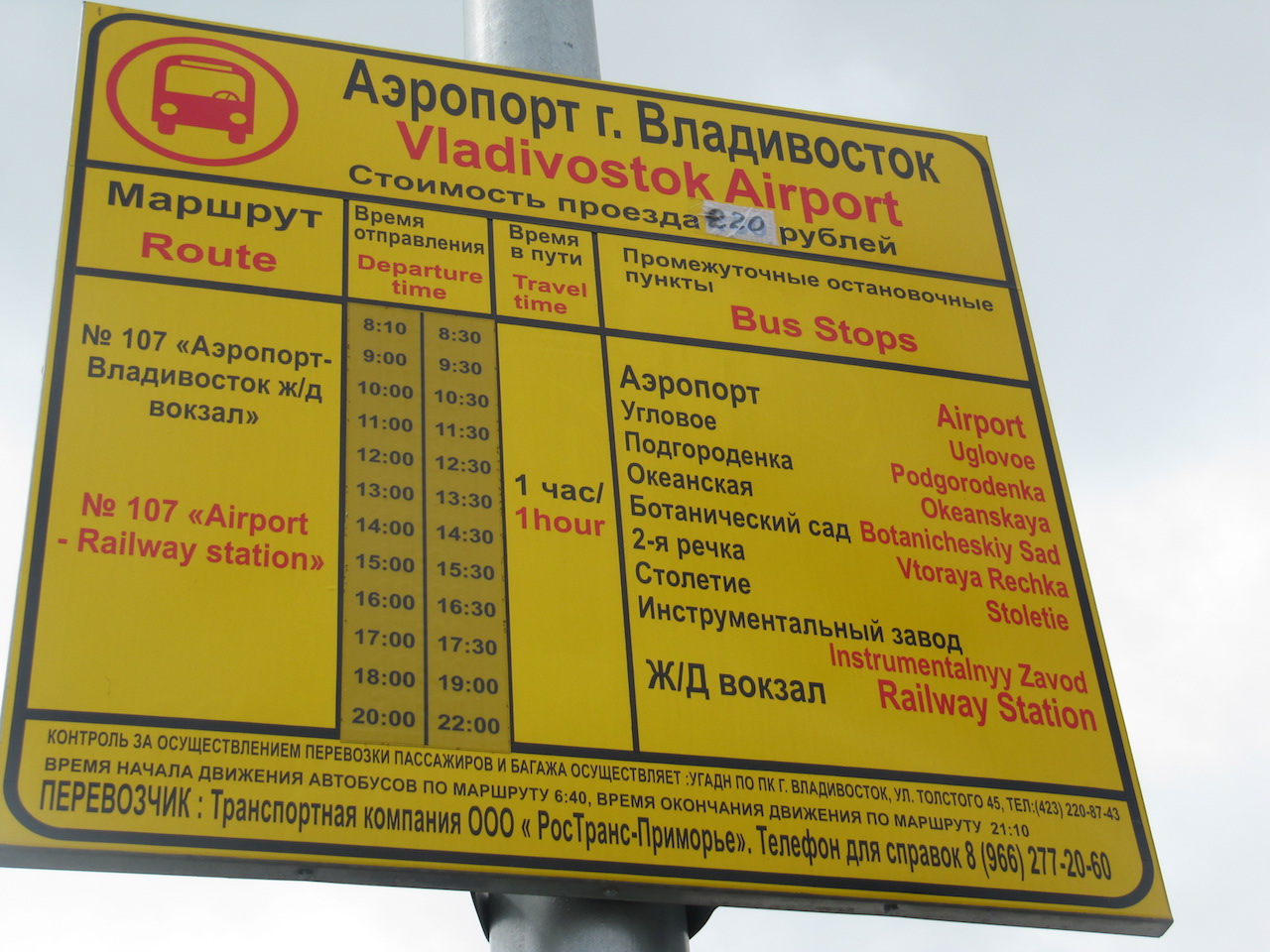 107番の終点は鉄道駅ですが、グーグルマップで停留所を確認し、ポクロフスキー公園(парк Покровский)で下車、オケアン通りに出て坂をくだり徒歩でホテルへ。鉄道駅から中央広場は平地ですが、中央広場からオケアン通りは上り坂です。料金、バスの時刻表はよく変わり、空港HP英語版の更新も不確かとのことなので、要現地確認。