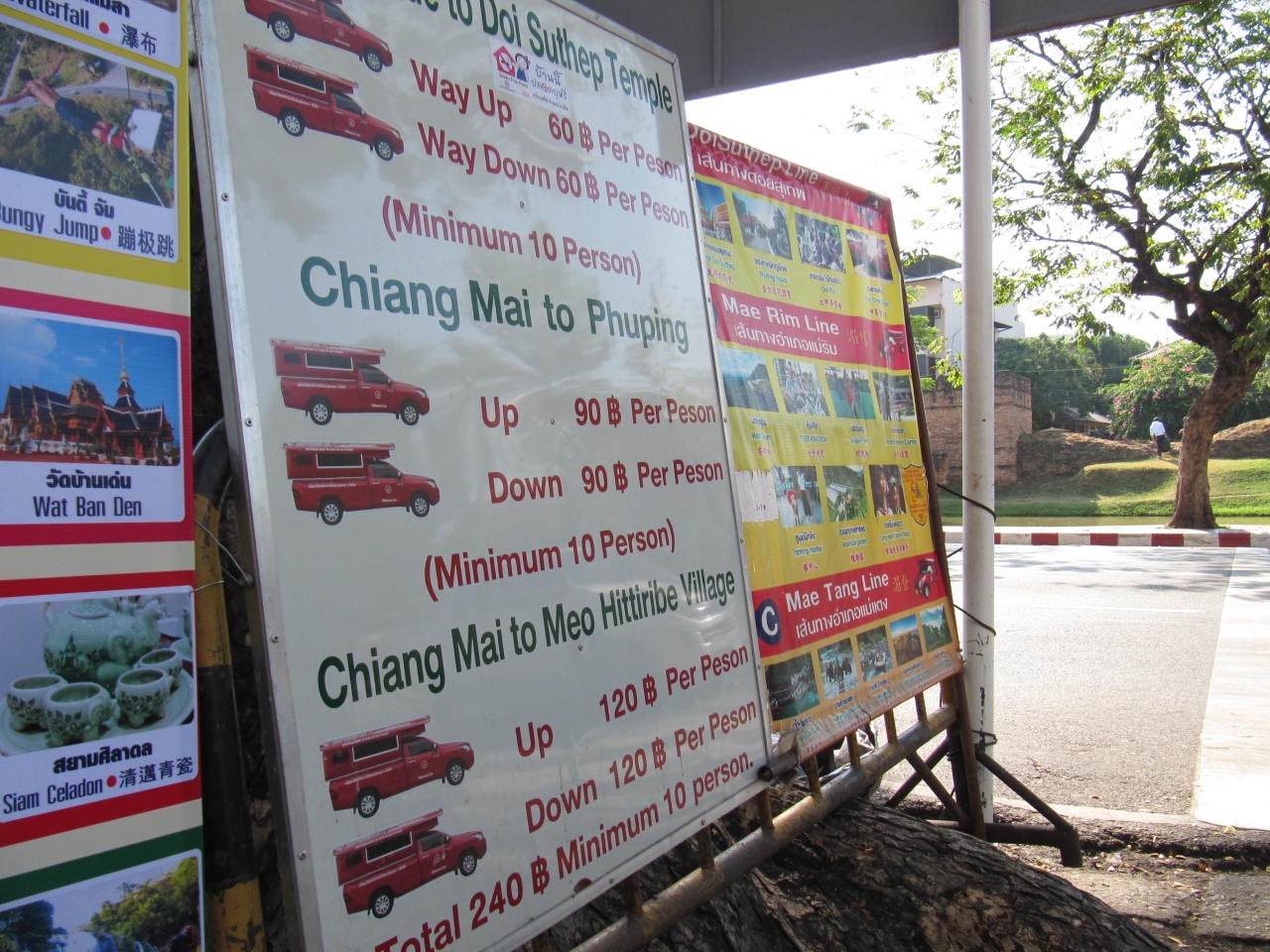 ワット・プラタート・ドイステープ寺院に行くために往復利用。旧市街の北門、チャン・プアク門のお堀を挟んだ7.11前に、ソンテウ乗場あり。係の人に行き先を聞かれ5分ほどで12人が集まり出発、係の人に前払い60THB。12月31日で休日か平日か分かりませんが、往路は動物園の辺りまで渋滞し、10:35発11:50着。