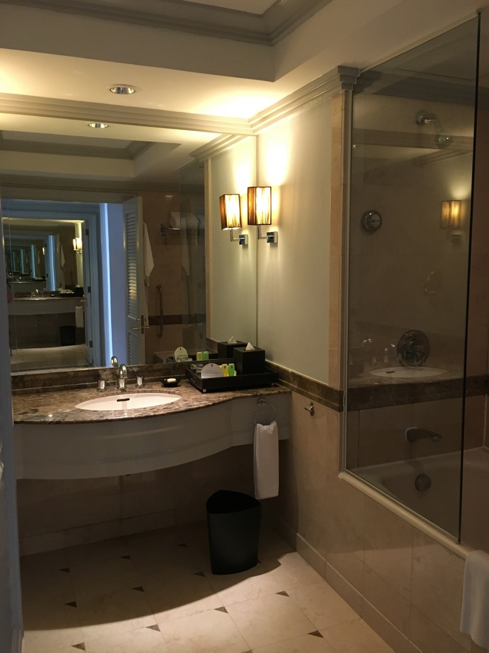 部屋は、ベッドを除いて日本のビジネスホテル並みの狭さです。洗面室もかなりコンパクトです。