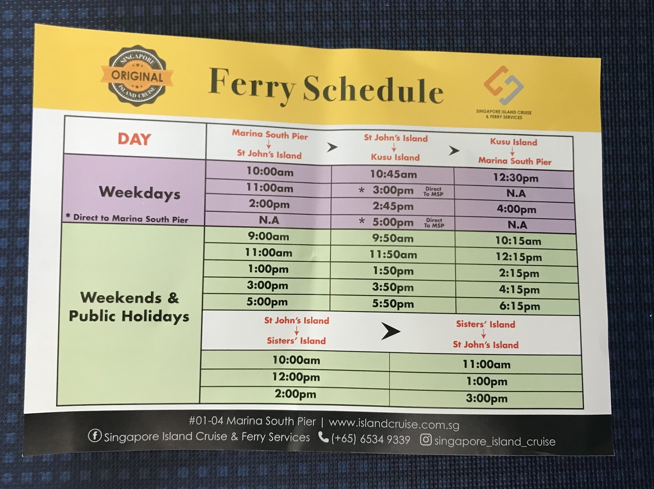 チケットの予約は、フェリー会社のホームページからも出来ますが、今回は当日にマリーナ・サウス・ピアのカウンターで購入しました。往復で$18でした。ホームページ経由で購入の方が、少し安くなるようです。恐らく2島巡りでも1島のみの往復でも同一料金かと思います。
