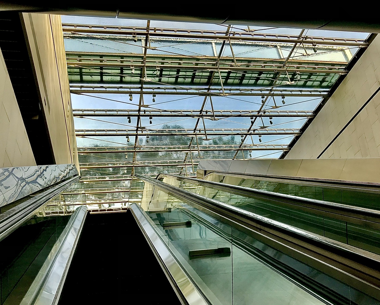 駅の地下1階の広大な天井(地面)は、水田の様にガラス天井に浅く水を張って、自然光が揺れる水面を通して光のゆらぎ効果を出しています。