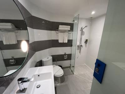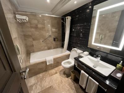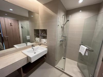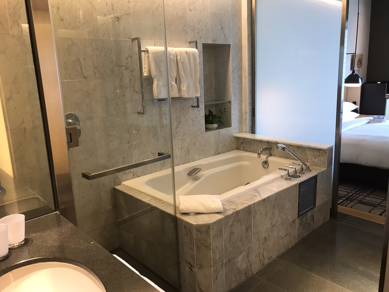 バスタブとシャワーブースは、少し離れている造りのホテルが多いのですが、このホテルはバスタブの足元の方より直接シャワーブースに移動できるので使い勝手が良かったです。