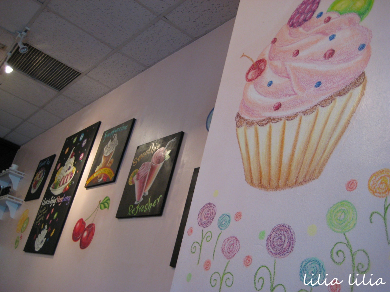 - 店内の壁画や看板がカワイイです。