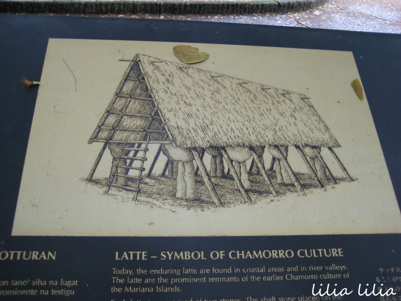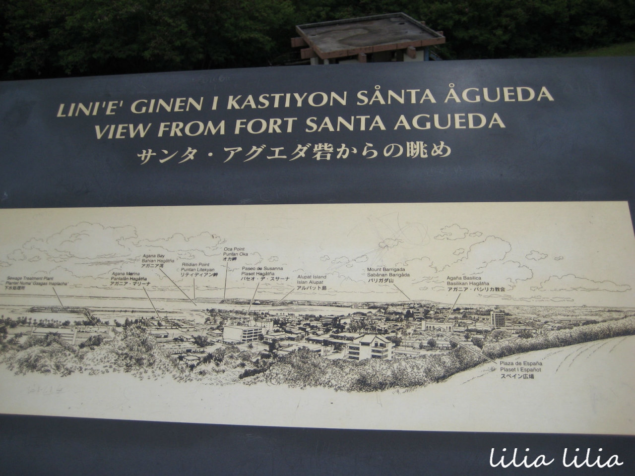 その横に恋人岬の伝説が多言語で書かれた石のパネルがあります。