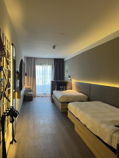サンツ駅から徒歩5分以内にあるマリオットグループのカジュアルホテルのモクシーに宿泊しました。空港からのアクセスはもちろん、観光地などどこへ行くにも便利でした。バルセロナということもあり、デザイン性が高い内装で、利用していませんが評価が高い朝食も人気のようです。2ダブルベッドのお部屋を予約したのですが、入室してみるとビックリ!縦にベッドが並んでいて、足を向かい合わせにするスタイルでした。水圧は少し弱めでしたが、特に困る事なく快適に過ごせました。ホテルの隣ビルにはスーパーマーケット、周辺にはバーガーキングやカフェ、ブラッスリーなどあり食には困りませんでした。リピートしても良いと思えるくらい立地良いホテルでした。