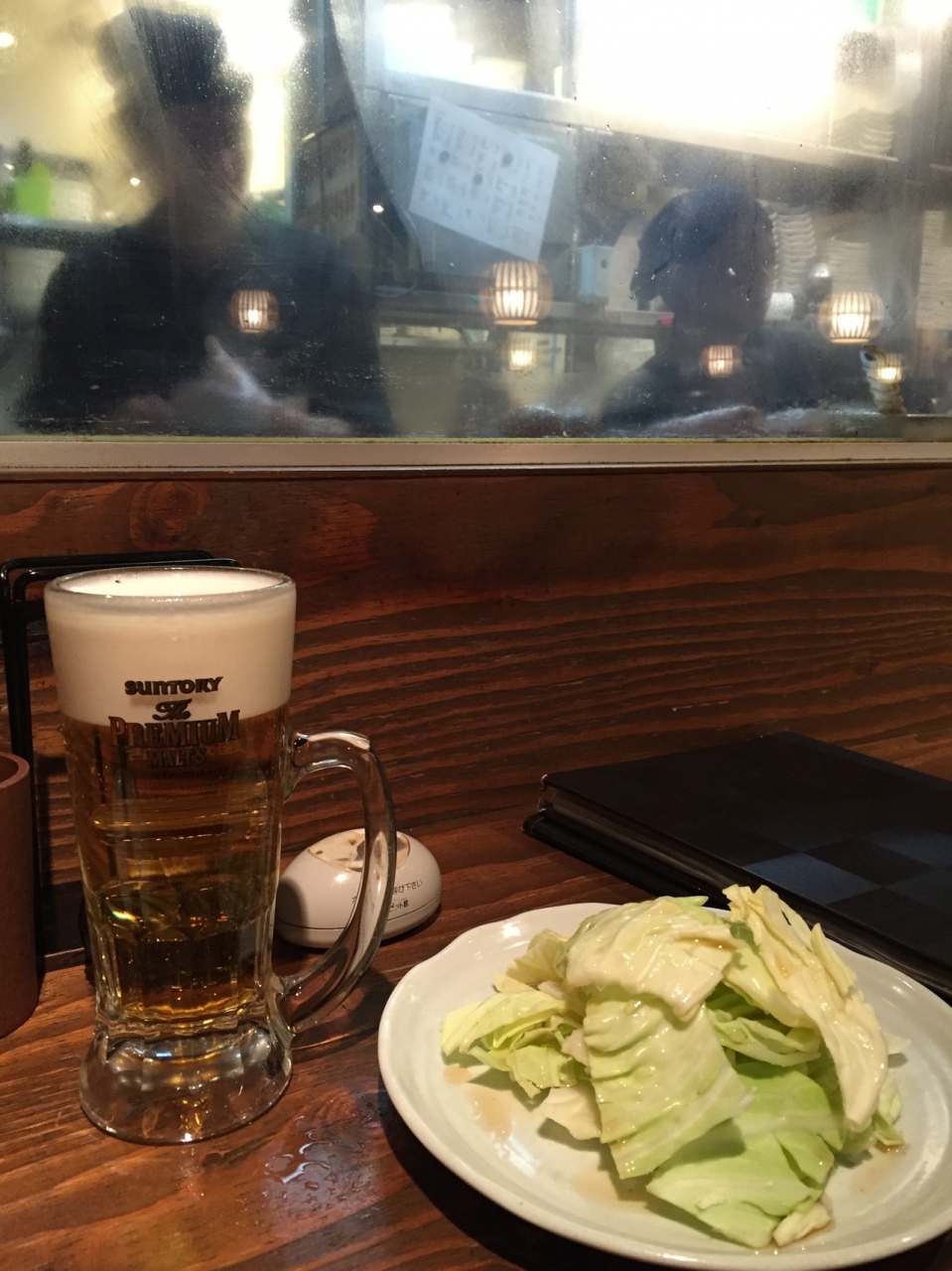 サラダは一人で食べるには少し量が多いということで注文しなかったら、お通しでキャベツが盛りだくさん出てきて ちょうど良かった。そのドレッシングが美味しくて、キャベツの上に鳥串タレを乗せられ、その相性が非常に良かった。