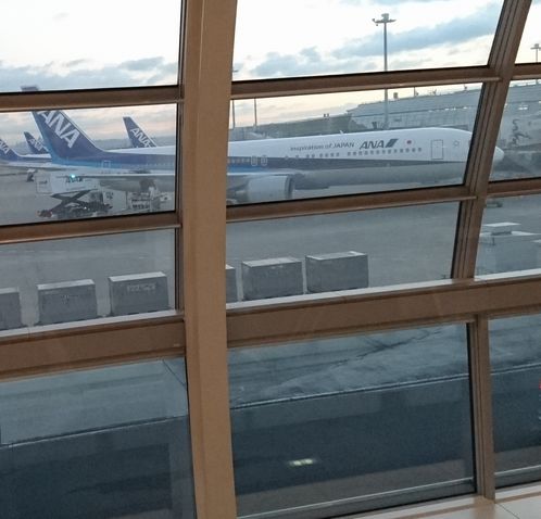 ANAに搭乗する場合はこちらのターミナルになります。早朝便の利用でしたので、まだ建物内は薄暗くロビーの椅子で寝ている人もいました。搭乗手続きや手荷物の預けも機械操作であっという間にすんでしまいました。本当に便利になりました。