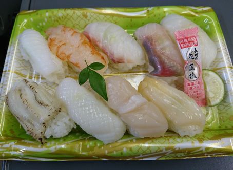 JR東京駅構内のグランスタ内にある店舗です。こちらの期間限定の「塩にぎり」を購入しました。お醤油ではなく、長崎の花藻塩とすだちで、風味を楽しみながら味わう握り寿司です。ネタは白身の魚が中心で、見た目も涼しそうで、すだちの風味が爽やかさを増し、夏にぴったりのお寿司でした。