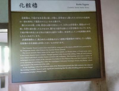 姫路城西の丸の北東、「西の丸長局(百間廊下)」の奥にありました。徳川秀忠と江の長女として生まれた千姫が、本多家に嫁いだ時に将軍家にもらった10万石の化粧料で建てた櫓だそうです。化粧櫓の内部は広く、在りし日の千姫が人形にて再現されていました。