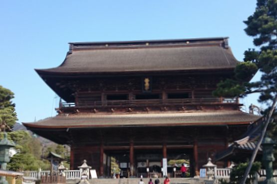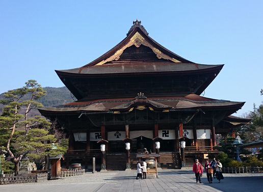 今回の旅行にはお参りの予定はなかったのですが、長野市内の宿泊ホテルに午前10時まで戻ってこられれば良かったので、急遽お参りの予定を入れました。ホテルでの朝食を早めにとり、バスで向かいました。バス料金は長野駅から片道150円、乗車時間は10分ぐらいでした。春休みなのに学生さんでバスは混雑していました。仲見世通りや境内は人は少なく心静かにお参りできました。二度目の善光寺参りでした。