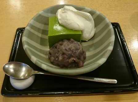 一番人気の抹茶ババロアを食しました。鮮やかな緑色のババロア、甘さ控えめのあんこと