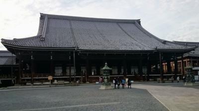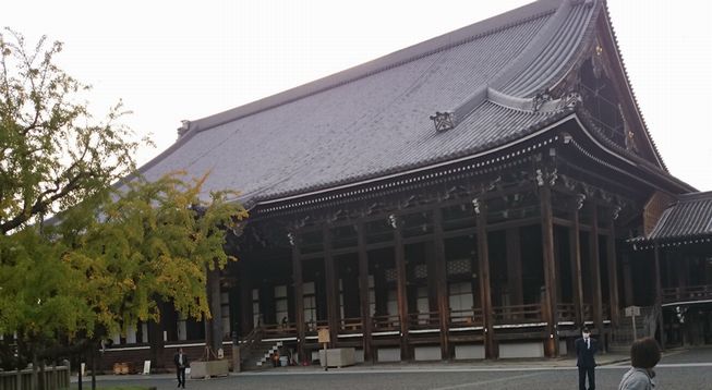 西本願寺の広い境内に佇む、大きな建物の左側が御影堂です。中央に親鸞聖人の木像、左右に本願寺歴代門主の御影が安置されています。前方には御影堂門、そして大銀杏の木があります。銀杏は色付き始めたばかりでした。