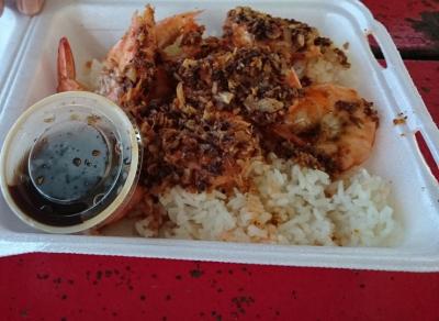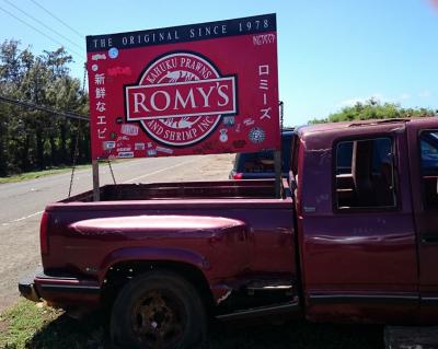 カメハメハ・ ハイウェイ(83号線)を北上すると右手に真っ赤な看板が見えてきます。目立ちますので見逃すことはないと思います。当日は7・8人並んでいて、注文するまで15分ぐらいかかりました。注文時に「30分ぐらい待ってください」と言われましたが、15分ぐらいで名前を呼ばれました。ガーリックシュリンプ美味しかったです。べたついた手を洗うことのできる洗面台があってよかったです。