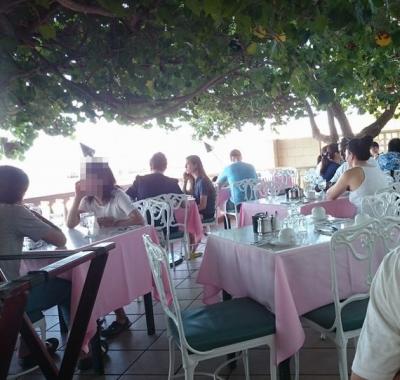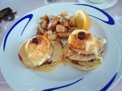 宿泊先のホテルから徒歩で10分ぐらいのところにありました。オープンエアスペースの真ん中に大きなハウの木がそびえ立ち、しかもオーシャンフロントのレストランです。ロケーションは最高です。予約はしてありませんでしたが、すぐに席に案内されました。案内された席はちょっと後方でしたが、ハウの木の真下で木陰になり気持ちよかったです。エッグベネディクトとロコモコ美味しいですが、量が多く食べきれませんでした。