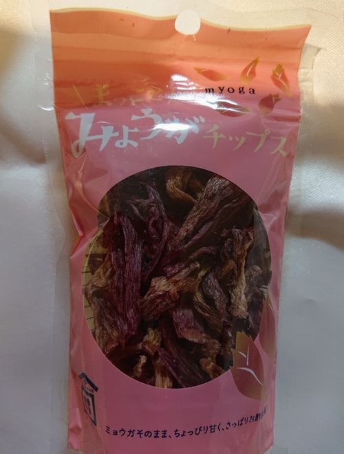 こちらの「みょうがチップス」をお土産として購入しました。乾燥したみょうがに軽く砂糖と酢がまぶしてあり食べやすくなっていました。そのまま食べてもいいし、サラダなどにトッピングしてもおいしかったです。こんなみょうがもたまにはいいです。