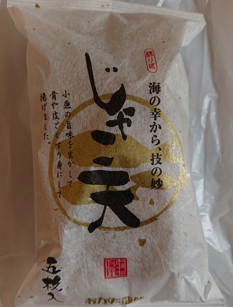 愛媛県西予市にあり蒲鉾などを製造販売しています。こちらの「じゃこ天」をいただきました。一袋に5枚入りで歯ごたえがあり味付けもよく美味しいじゃこ天でした。和紙風の包み紙でちょっと高級感があり、贈答用にもお勧めです。