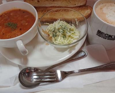 JR上野駅構内にあるカフェで、各地の駅構内でよく見かけるチェーン店です。電車の待ち時間にこちらでモーニングをいただきました。日頃野菜不足を意識して「8種の野菜のミネストローネプレート」をいただきました。飲み物付きで500円でした。ボリュームがあり美味しかったです。