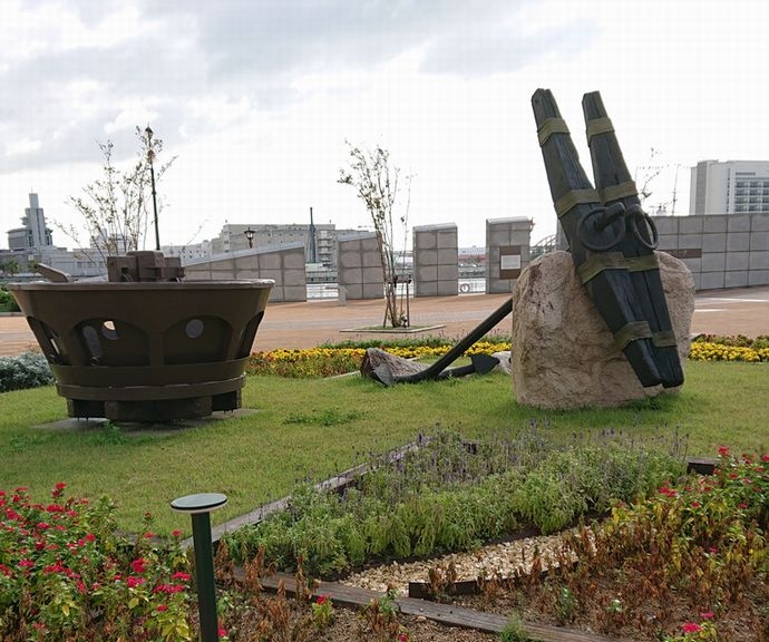 メリケンパーク散策中に見かけました。メリケンパーク内に復元されたサンタマリア号が展示されていましたが、現在は船は解体され望楼と錨のみが展示されていました。船体がないのでちょっと寂しい展示でした。近くの説明板には航海の記録などが書かれていました。