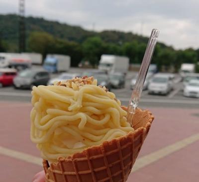 山陽自動車道上り線にある龍野西サービスエリアのフードコートで目に留まった「イモンブランソフト」。モンブランの前の「イ」は何だろうと疑問に思って聞いたら、「イモ」の「イ」で、ソフトの上には栗ではなくいもクリームでした。想像しきれなかった頭が固い自分にびっくりでした(笑)。そこまで聞いておいて購入しないのも何なんで、いただきました「イモンブランソフト」。塩ソフトと甘さのあるいもクリームのバランスよく美味しかったです。