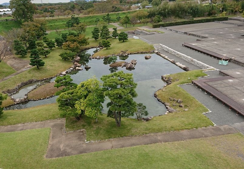 赤穂城の本丸門(平成8年に復元)をくぐると広い敷地があり、そこは整備された公園になっていました。本丸御殿の間取りがプレートで表示されていたり、奥には庭園がありました。天守台を上がると本丸御殿があったところや庭園、城門など一望できました。
