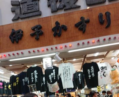 道後ハイカラ通りにあるお土産屋さんです。店内は広く愛媛県の特産品などお土産類は一通り揃っていました。こちらでは、絣で作られたバックや帽子、上着などもありましたし、「先の見えないダイエット」や「日経平均は俺に連動する」などプリントされたユニークなTシャツも売られていました。