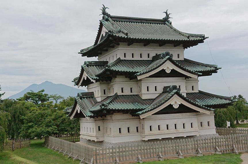現存天守12城のうちのひとつで、東北地方では唯一「弘前城」だけです。現在石垣の修理のため本来ある場所に天守はなく平地に移動していました。石垣がないとバランスがおかしく、また、天守は小さいこともあり可愛らしく感じました。天守前には展望デッキがあり、岩木山とのコラボ写真が撮れました。