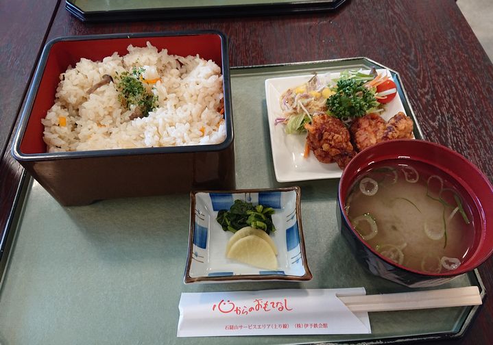 松山自動車道のいよ小松JCTといよ西条ICの間にあるサービスエリアです。こちらのフードコート「浪漫食堂」でランチにしました。入口に10名ぐらい並んでいましたが、それほど待たずに席に着けました。店員さんがきちんと案内してくれるので、席を探すストレスが無かったのが良かったです。席についてからは、通常のフードコートと同様で、チケットを購入して、ベルを渡され呼ばれたら取りに行きました。
