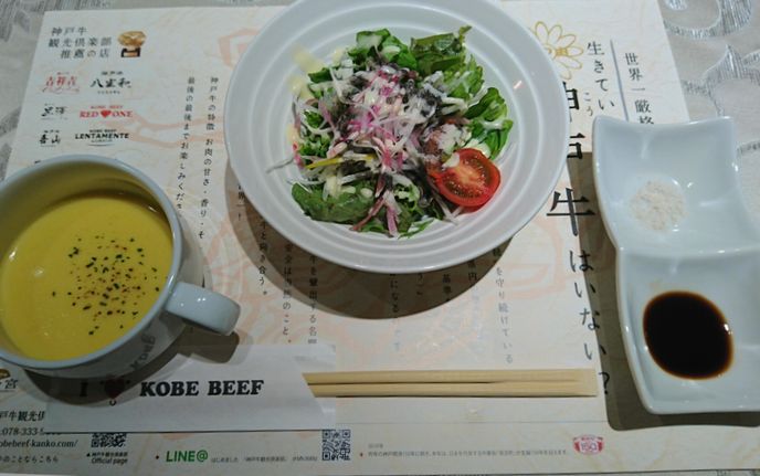 神戸元町商店街を散策中に牛のオブジェが目に留まり、神戸に来たなら「神戸牛」でも頂きましょうと入って見ました。お店は2階にあり、半分ぐらい席は埋まっていました。ランチはステーキ肉を選ぶとライス、サラダ、スープは無料でついてきました。お肉は柔らかく美味しく頂きました。店員さんはどの方も感じよい対応で好感持てました。