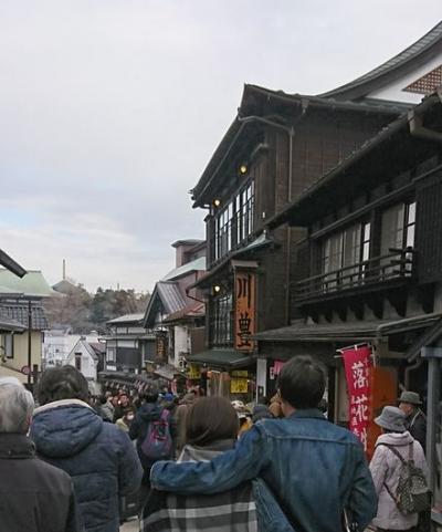 成田山新勝寺でお参りをすませ、表参道を散策しました。参道沿いにはお土産店や飲食店などが軒を連ね、初詣の参拝客で賑わっていました。特にこちらでは、名物の鰻屋さんが多く、軒先でうなぎをさばいていたり、うなぎを焼く美味しそうな匂いが漂っていました。
