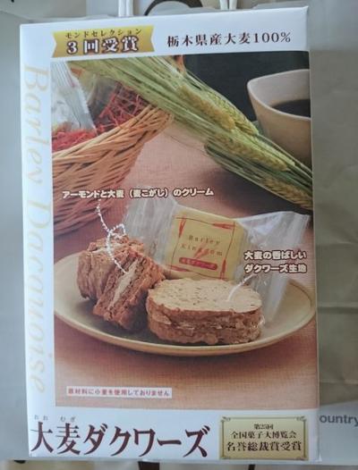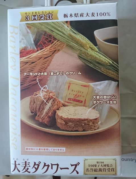 大麦工房ロアさんの「大麦ダグワーズ」をいただきました。地元産の大麦を100%使用しているお菓子で、とてもかるくまわりはサックとして、中にクリームがサンドされていました。大麦の風味も感じられ全体的に甘さ抑え目でした。子供からお年寄りまで喜ばれるお菓子だと思います。