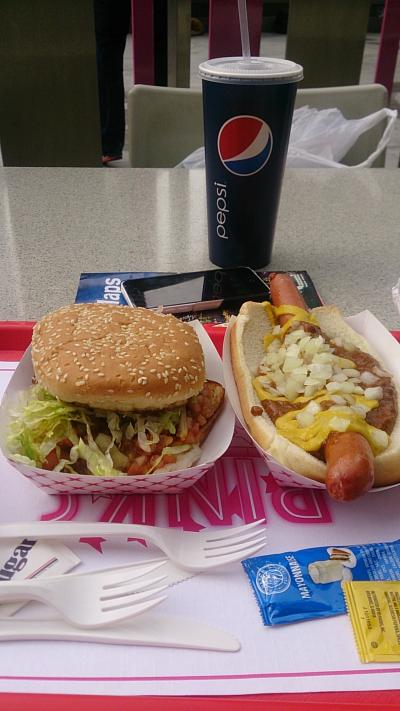 昔ロスに行ったときにハンバーガーを食べて、美味しかった記憶があるので、ラスベガス店にも行ってみました。ミラクルマイルズショップにありますが中ではなく路面店でした。有名なのはホットドッグですが自分はやはりハンバーガーを食べました。