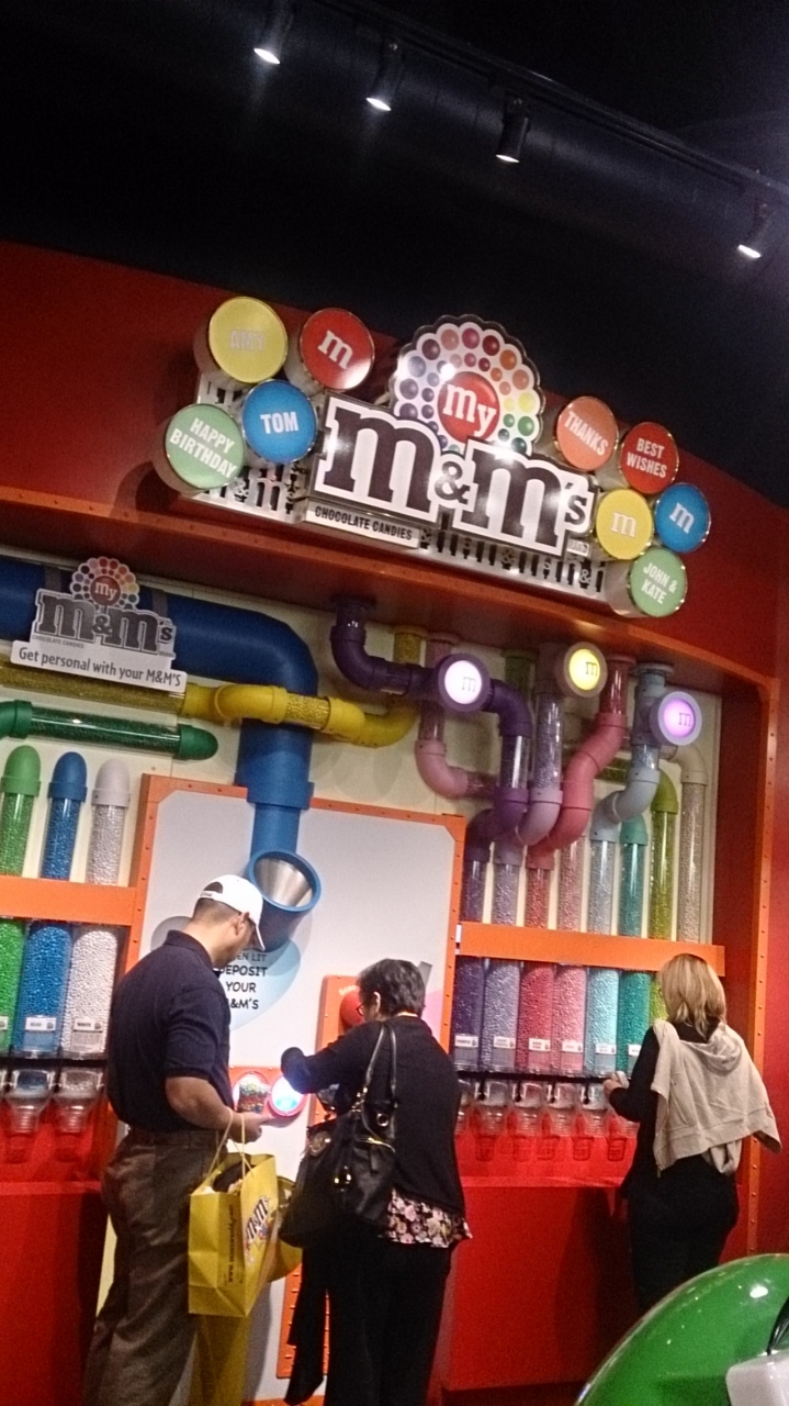 ここは最初訪れたときからあり、根強い人気です。今までは一階をチラッと見る程度でしたが、お馴染みのm&mチョコに名前が入れられるとのことで、四階まで行ってみました。注文機は3台ありましたが平日でも三人ぐらい並んでました。
