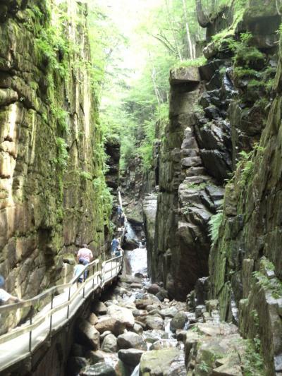 ボストンからインターステート93で2時間ほど車で北上したところにある渓谷、Flume Gorge。Franconia Notch州立公園エリアにあります。この一帯は、夏は避暑地、秋は色とりどりの紅葉、冬はスキーと、季節を通して楽しめます。Flume Gorge自体は5月初めから10月末までのオープンです。今回は夏に訪れましたが、以前ニューハンプシャーに住んでいた頃には、紅葉が美しい秋にも訪れたことがあります。