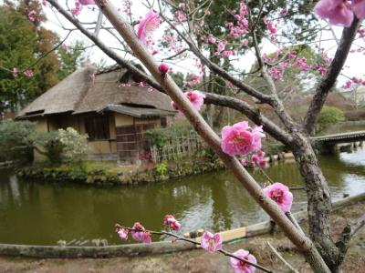 お金を払って、庭園の方に入ると、池中亭茶屋と梅が、とても素敵な風景を作っています。