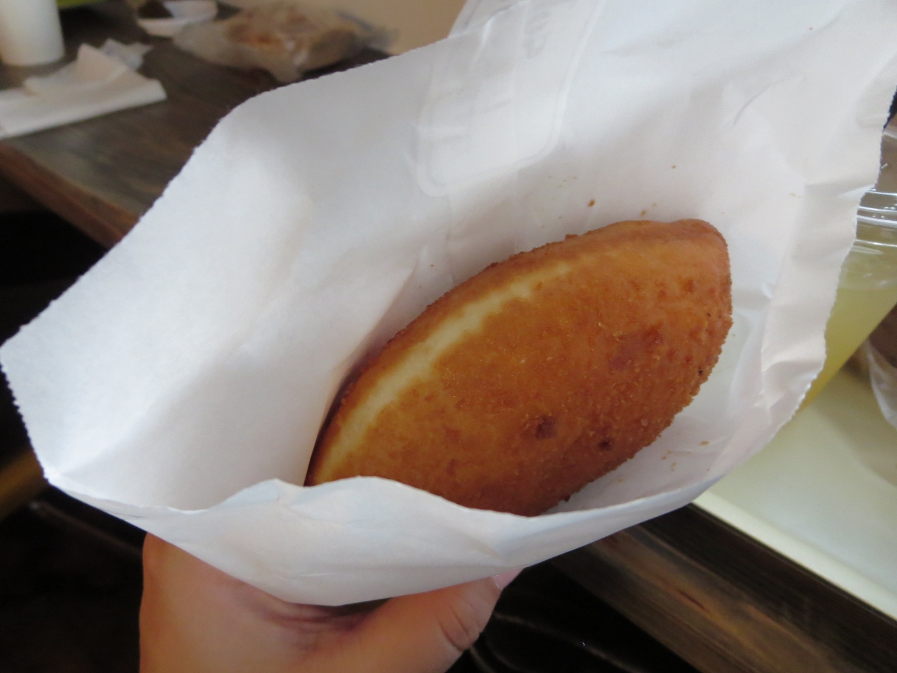 いろんな種類があるカレーパンは、その場で揚げてくれるので、さくさく感を味わえます。私は、なすときのこのカレーパンにしましたが、具もおいしく、辛すぎずで、子供さんも食べられそうです。