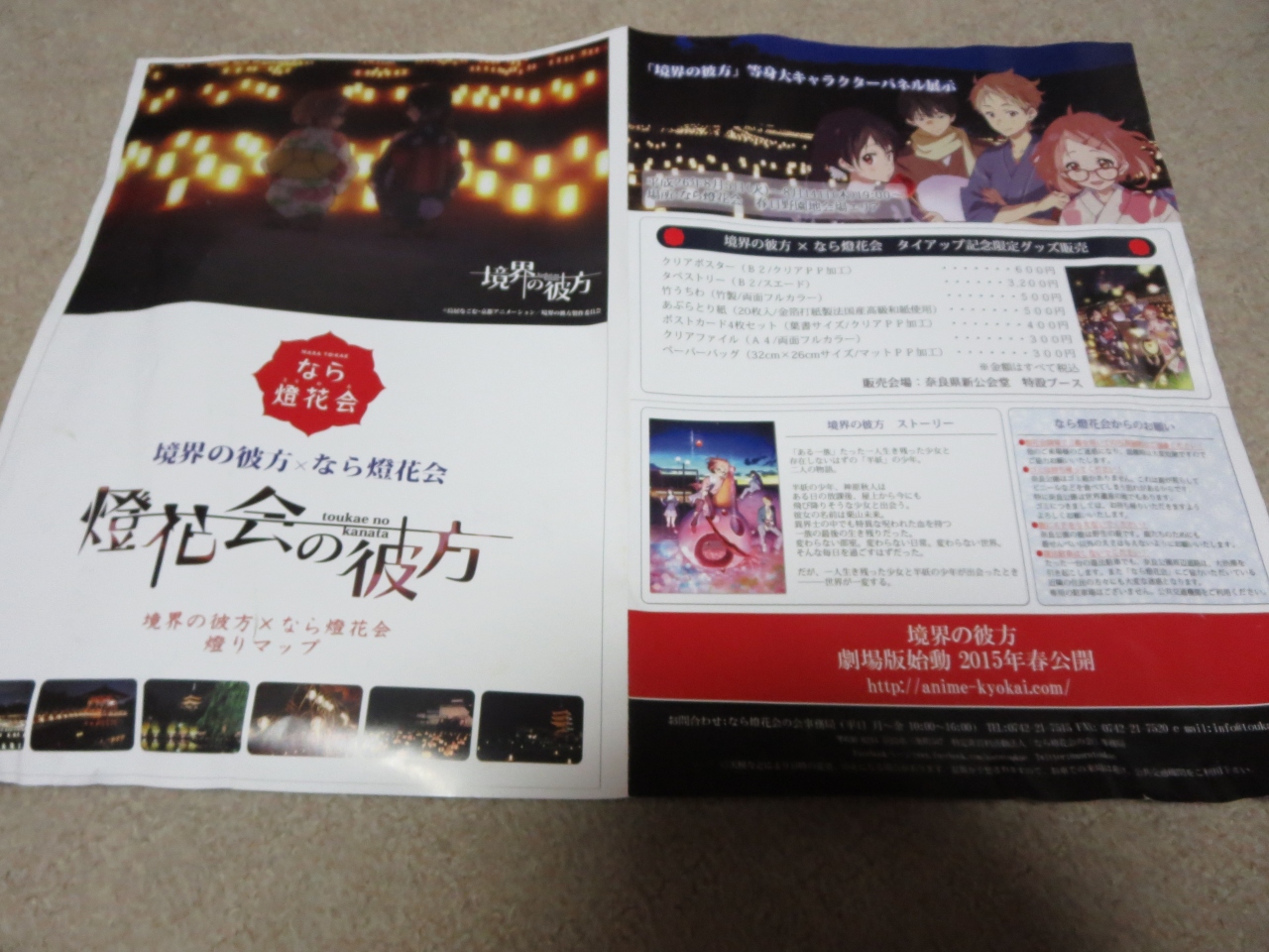 2014年から、新公会堂も会場に加わり、プロジェクションマッピングをしているようです。また、2014年は、燈花会とアニメ「境界の彼方」がコラボしていて、等身大パネルが春日野園地に設置されたり、コラボマップがもらえたりします。