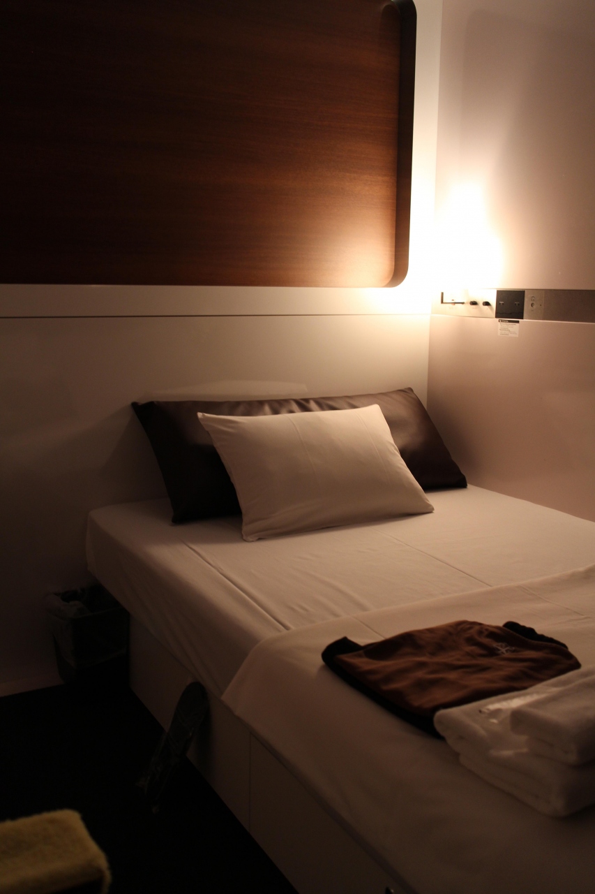 後泊で1泊しました。結構たくさんの宿泊客がいました。お風呂は大浴場とシャワーブースがあり、孤立していてシャワーは少ないので先客がいると入れません。部屋は個室ではなく区切られているだけなので音はよく聞こえます。私は気にならないのですが、耳栓もくれます。荷物の整理をしたかったらビジネスクラスキャビンよりファーストクラスキャビンの方が良いと思います。